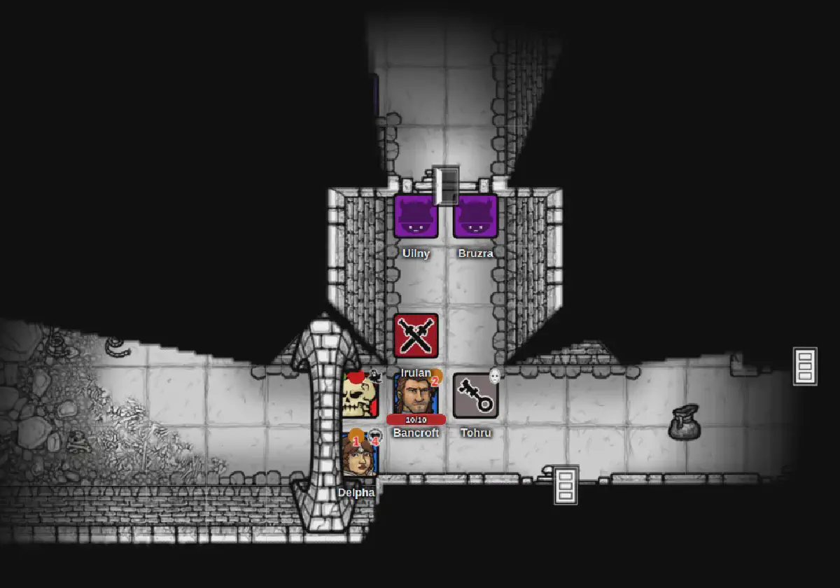 Bancroft took a minor blow but returned a strong one. Delpha invoked Fortunata and forced two of the skeletons to flee, though a troubling cloud of darkness surrounded her holy symbol as she did. After a moment of confusion to relight the torches, and a glowing magic missile from Druidly, Bancroft and Irulan landed solid blows on the one that remained and it collapsed into a pile of bones. Uliny, one of the new crew, did courageous work bringing the lantern into the room to help the party fight. The whole party followed the fleeing skeletons further north, finding them trapped in a small alcove.