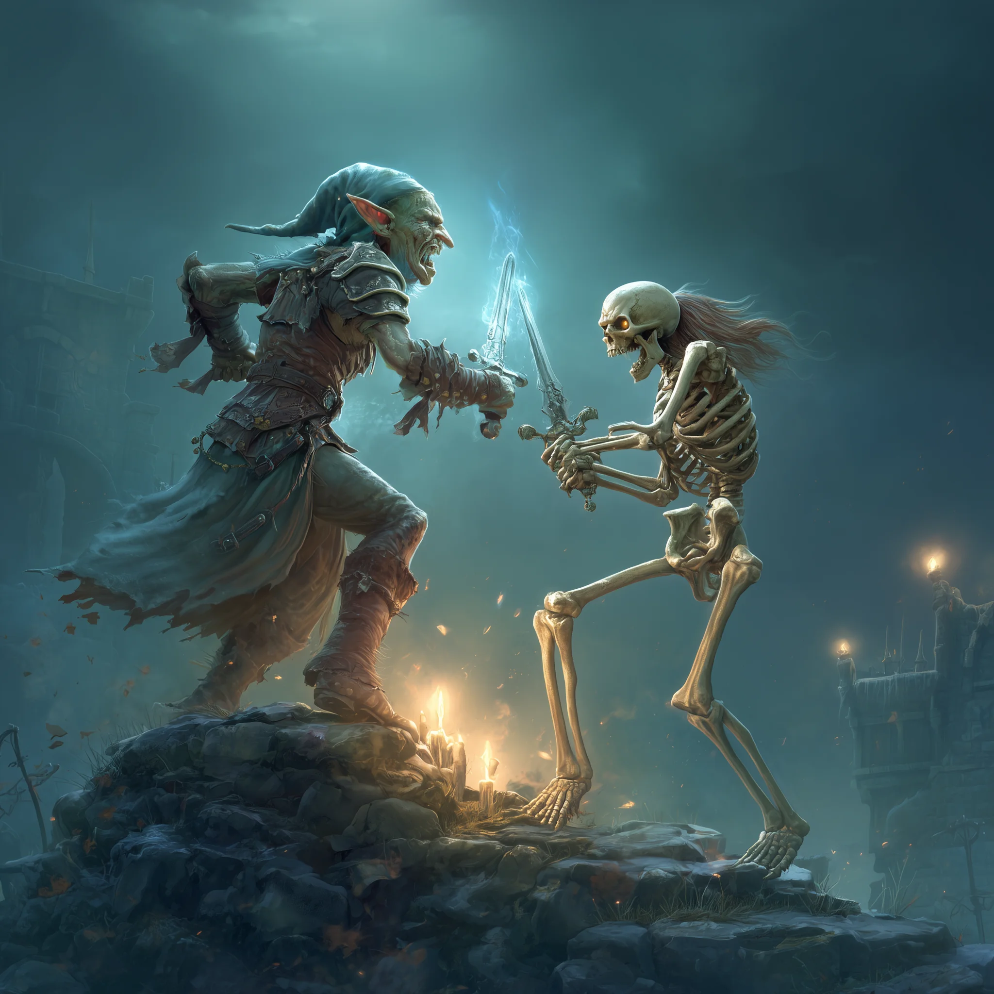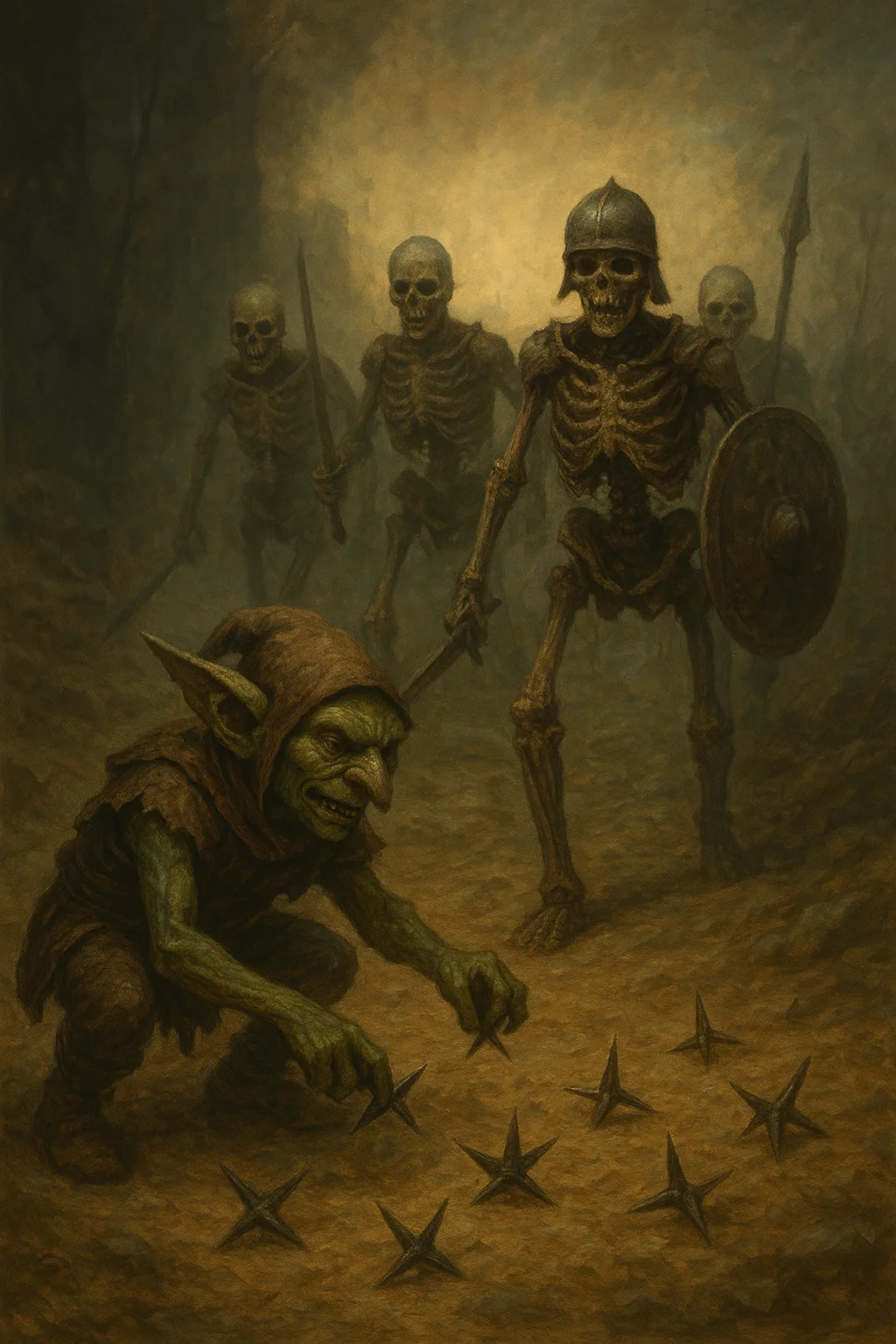 Idrivian’s second attack proved no more successful than his first, his sword once again finding only empty space where skeleton should have been. The undead warriors, however, had no such trouble with their aim. One skeleton charged Wyz directly, its rusted blade whistling past the goblin’s head by mere inches. Wyz responded with his magical dagger, employing a clever feint before landing a solid strike that sent bone chips flying.
