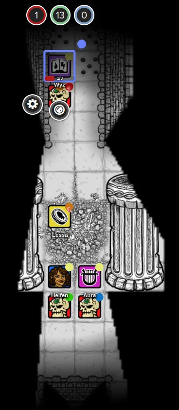 Wyz attempted another sling shot but found his aim wanting in the heat of battle. Lessa, bleeding and desperate, crawled into a corner like a wounded animal seeking shelter, while Helfen demonstrated that discretion was indeed the better part of valor by sneaking past the skeletons and disappearing through the door.