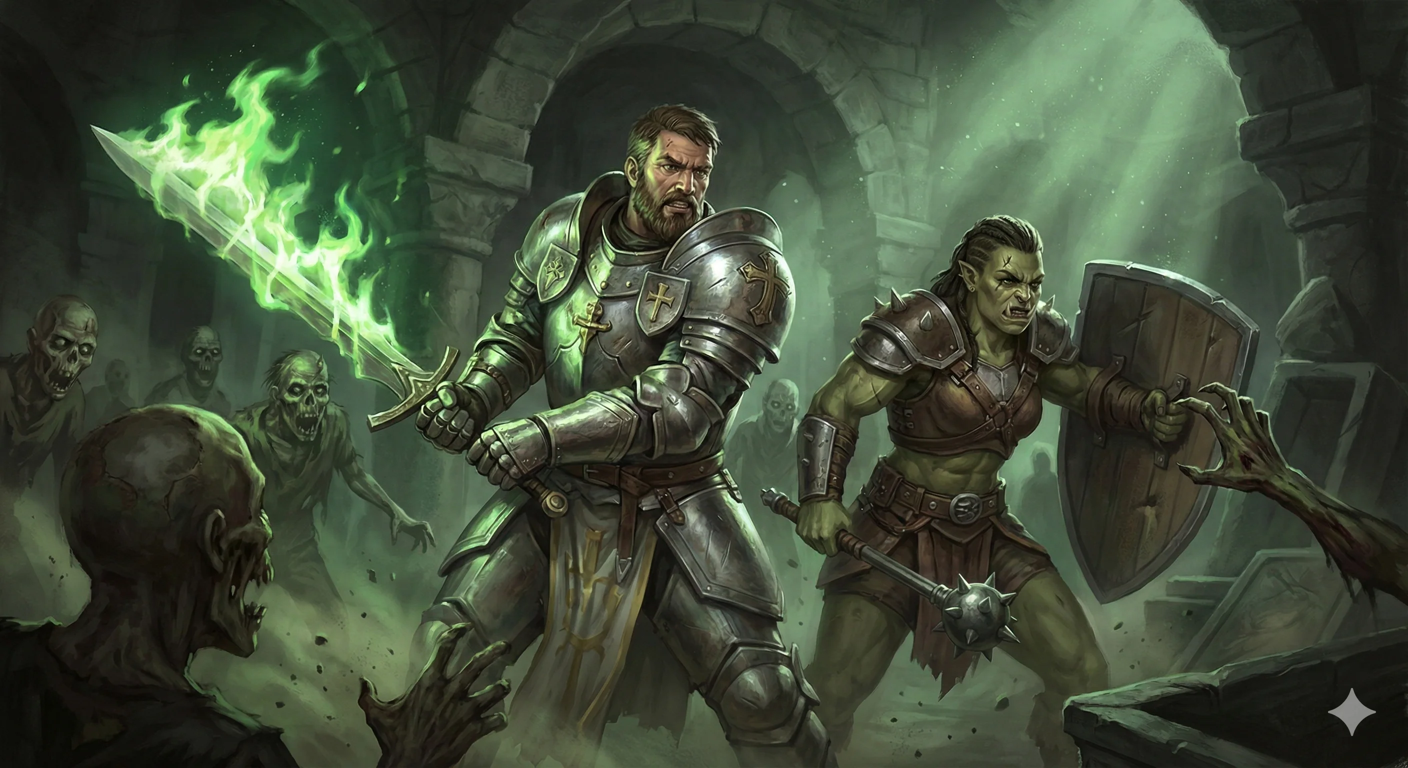 A sling stone from Mirumi whizzed past his head, and a dart of pure magic from Luxsley slammed into the zombie’s shoulder. As more of the shambling dead pressed forward, Bancroft and Irulan held the line, a bulwark against the tide of death. When four zombies clawed at their shields, Bancroft judged the moment to be right. He raised his holy symbol, the green fire on his sword flaring in response. “Be gone, foul things!” he roared, channeling the full might of his patron’s wrath. Two of the creatures were instantly consumed by the same green flames that had taken the first. The others, their dead minds somehow sensing the overwhelming power, turned and fled back into the darkness of the tomb.