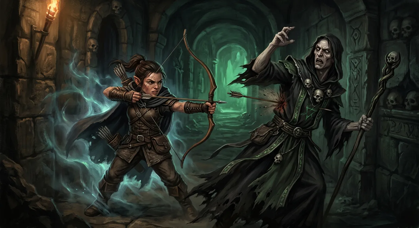 A small rogue drawing a bow from the shadows behind a wounded necromancer in a dark dungeon corridor
