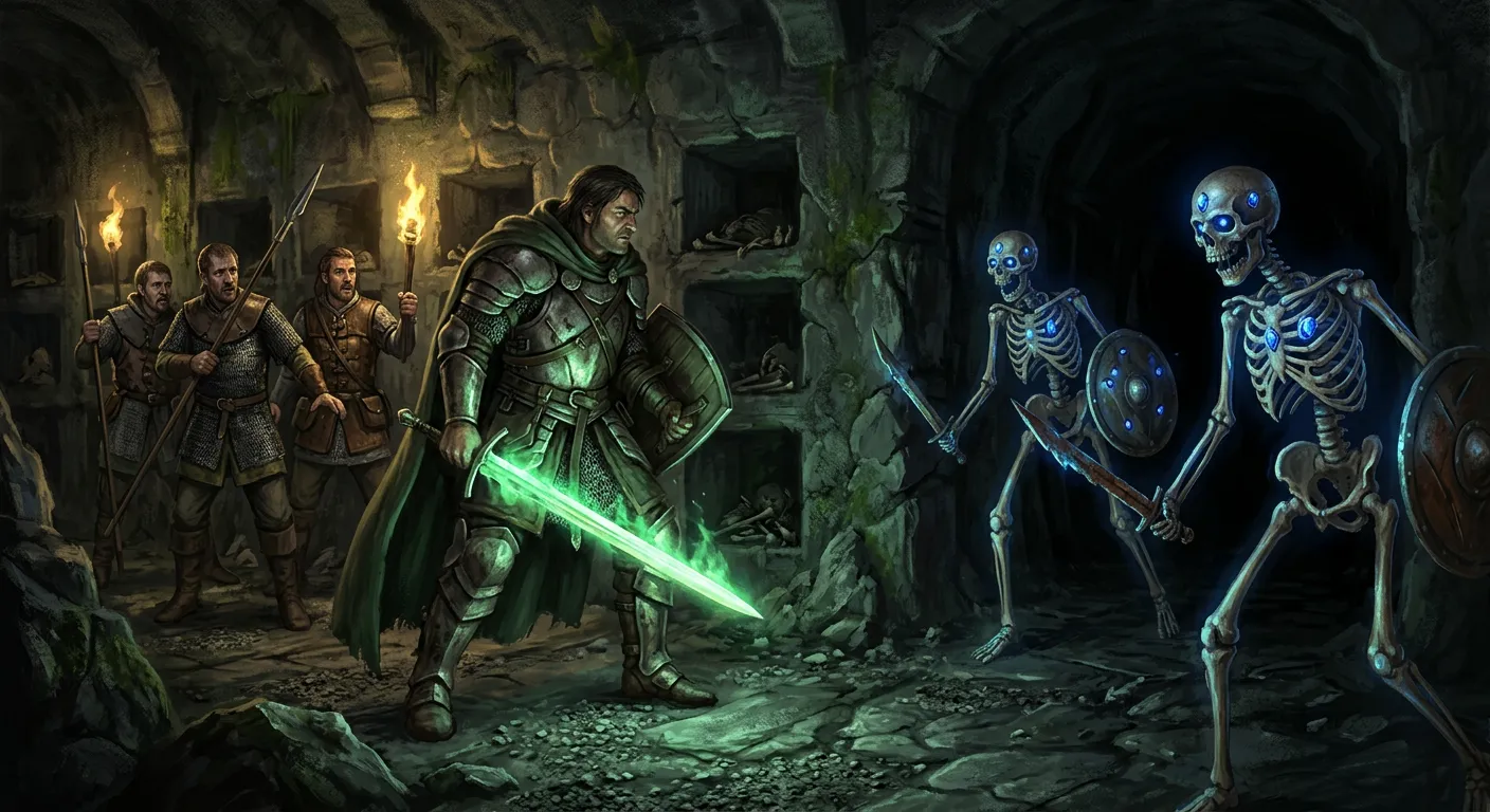 Two sapphire-skulled skeletons emerging from the darkness of a burial chamber, facing a knight with a green-glowing sword