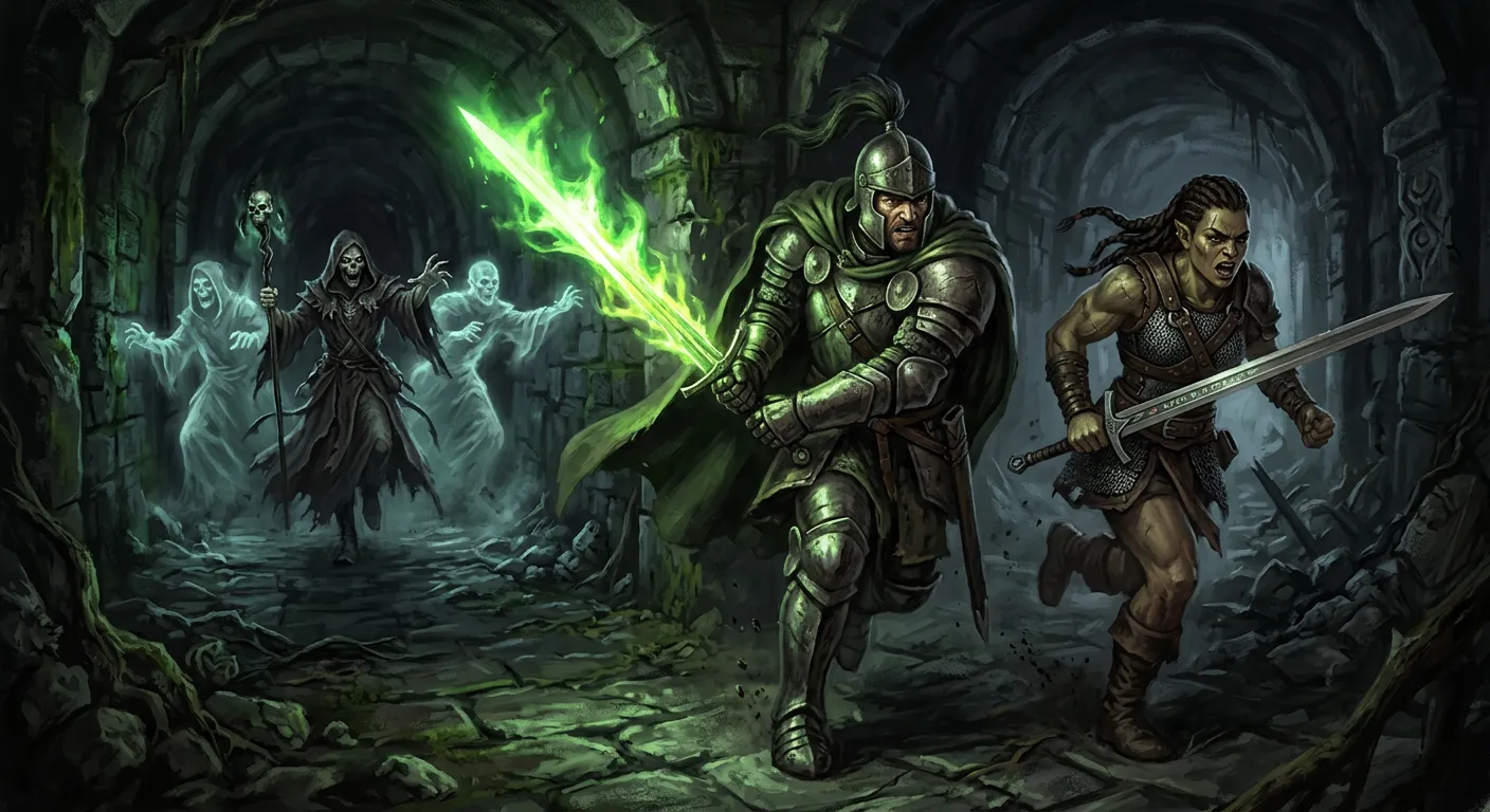 Bancroft cast Light again. The third time that night. It worked the way it always worked — barely. The green glow returned to his blade and he ran after the necromancer in the corridor, plate armor clanking, the sound of a man who had given up on subtlety.