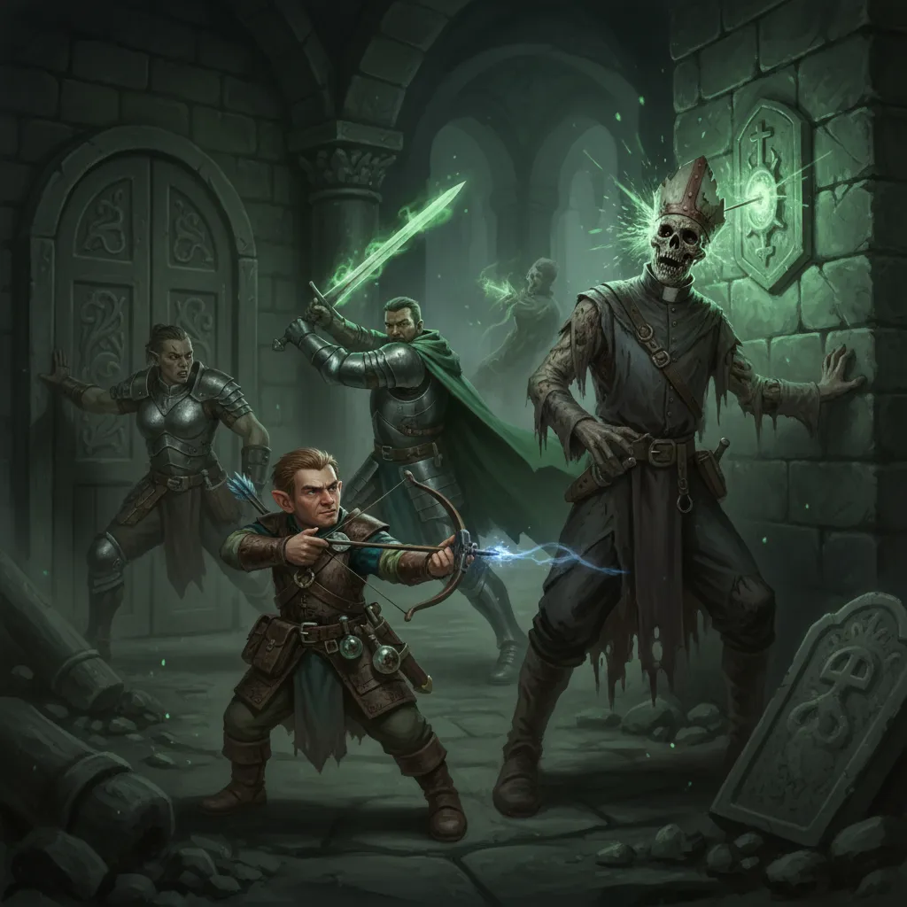 The Huecuva didn’t care about failed prayers. They kept coming. Disease touches rained down on the party — hands reaching, pressing, finding skin. The recruits fired from the back. Anister’s arrows hit nothing. Driah’s bolt went wide. Ghalf’s sling stone sailed past everything and struck a wall.