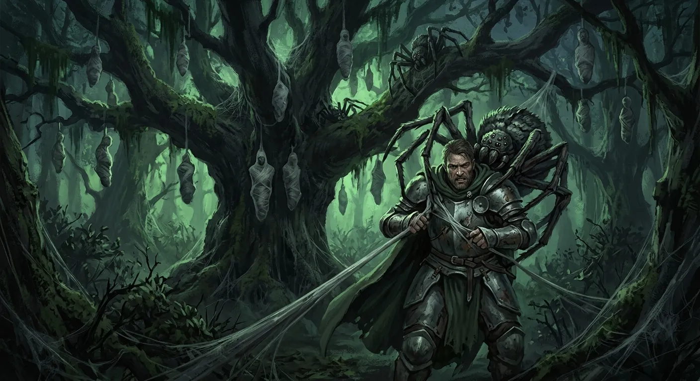He felt it starting. Something drawing out of him — not blood, or not only blood, but something deeper. Warmth. Weight. The substance of being alive. His body tried to fight the venom and couldn’t. The rot from the Huecuva was barely out of his blood. The priests of St. Ygg had cured the disease, but the weeks of it had hollowed him out, and what was left wasn’t enough to resist what the spider was doing to him now.