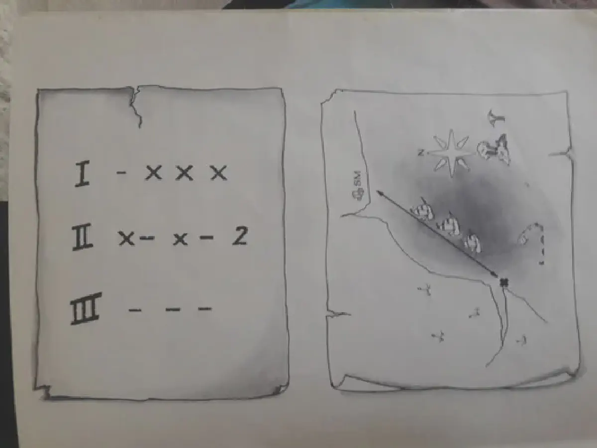 Exploring the unmarked door first, the party found a combination office and living quarters, of clearly better quality than the group living outside. Several books, better clothes (including oilskin cloak and boots), a map of the local coastline, and (under a loose flagstone) a small, locked iron box. Two parchments were also located, one with a set of words in the common tongue and what appears to be translations in some other language, and the other with a sequence of cryptic signs and markings.