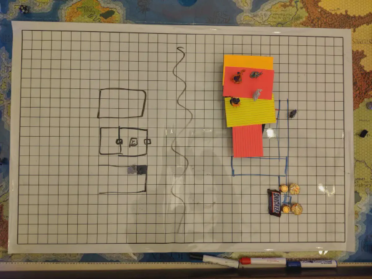 Meanwhile, Pyrcival led the rest of the group to a series of three possible smuggling operations within Highport, identified by the Thieves’ Guild markings for “Fence of stolen goods”. He started at the Prawn Shop, a buyer and seller of good both used and well-used, and also made inquiries at an orphanage (the same one Tiberium and Warin had previously asked questions about), and a blacksmith. After a clandestine meeting at a local pub to discuss importing “figurines”, they were left with a suspiciously large bill that Kirjel was able to expense to the Duke.